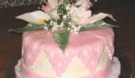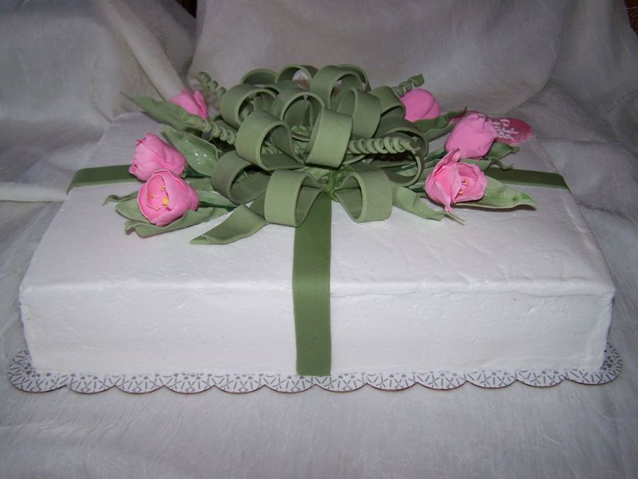 This was my first attempt with gum paste. With the help of a wonderful CC member, whom I met while taking a wilton class, I was able to accomplish this. My first payed for cake. It wasn't perfect. After rolling out the gumpaste for the bow we took a stencil and rolled over it and it left an impression on the ribbon.