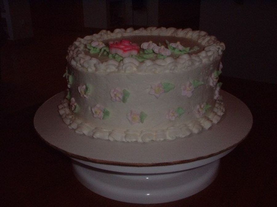 This was my first cake. BC icing, rose, and leaves. Small RI flowers on top and sides.