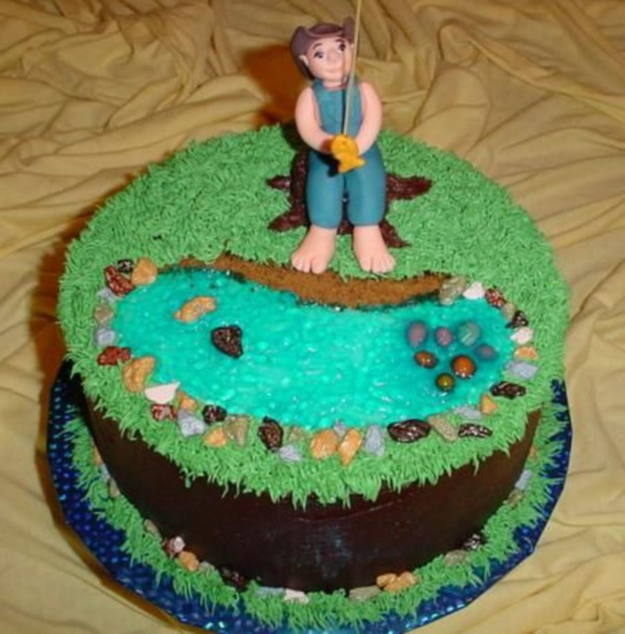 Little Fisherman sitting on a tree stump is made from fondant and his little fish is a mini-bites goldfish cracker. The cake is Double Chocolate Layer Cake with Bittersweet Chocolate frosting. The grass is buttercream and the little pond is sky blue colored piping gel (my camera makes up its own colors). This cake was ordered for my customer's hubby's 60th Birthday.