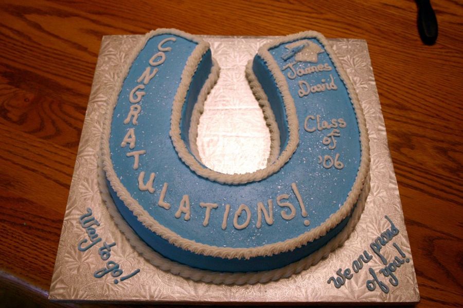 This is for an elementary school graduation. The school colors are blue and white, and their mascot is the Stallion. This is why the horseshoe pan was requested. For me, decorating the inside of the horseshoe was a little difficult. I used the rope border and buttercream icing.