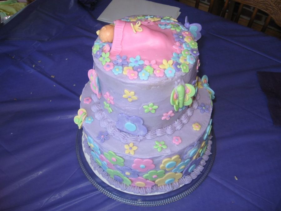 baby shower cake for my little sister, vanilla cake strawberry cream cheese filling. theme was butterflies and flowers..
