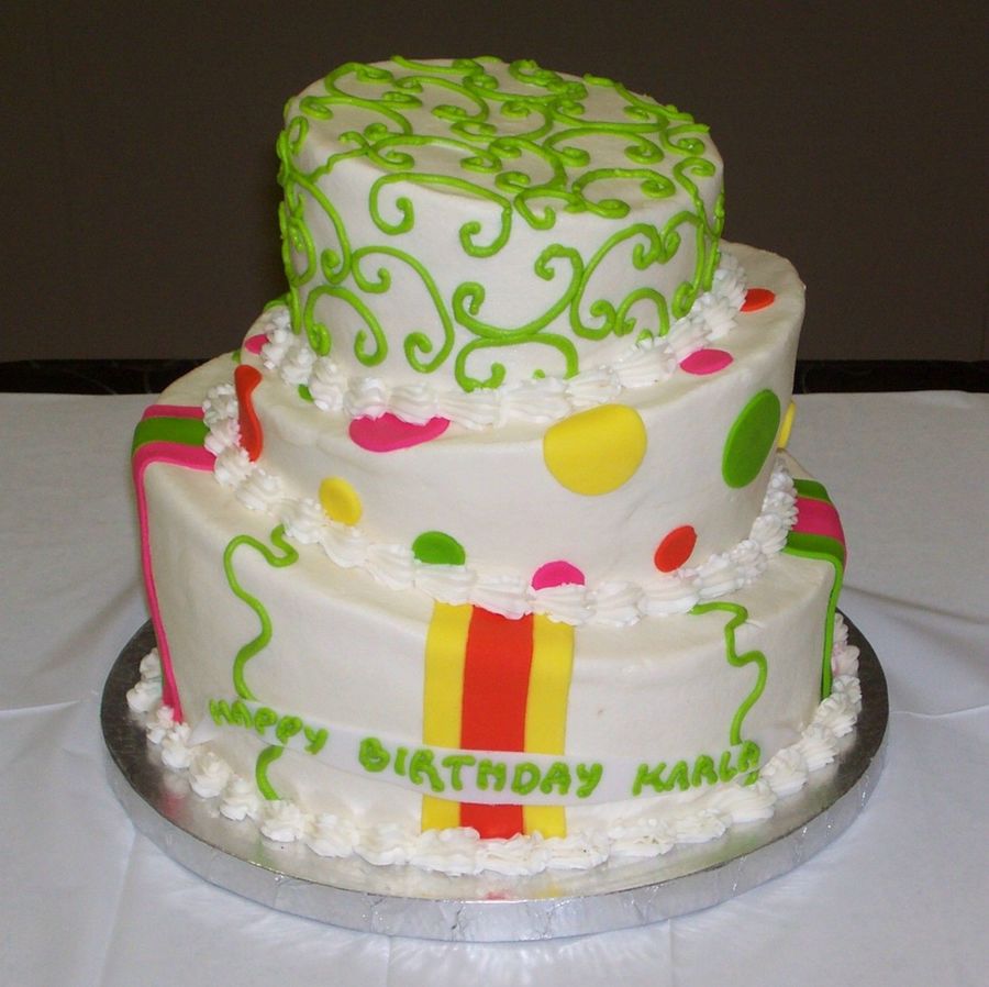 THis was for a surprise 50th BD party. The birthday girl loves the topsy-turvy cakes and likes the bright colors. Tried to make it as small as I could. Used 10", 8" and 6" cakes, BC frosting and fondant accents.