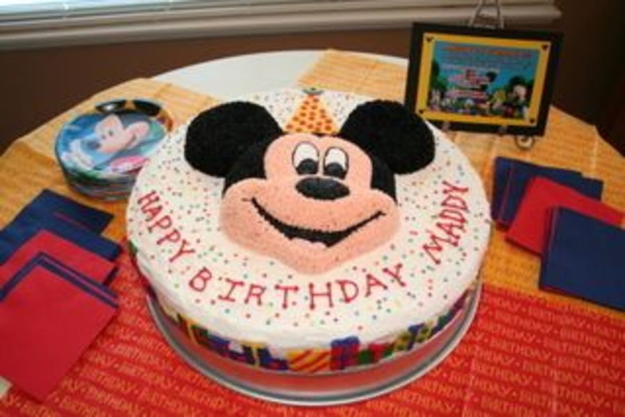 16" round cake with Mickey face on top with buttercream stars, fondant presents circle the bottom. The hat is also fondant.