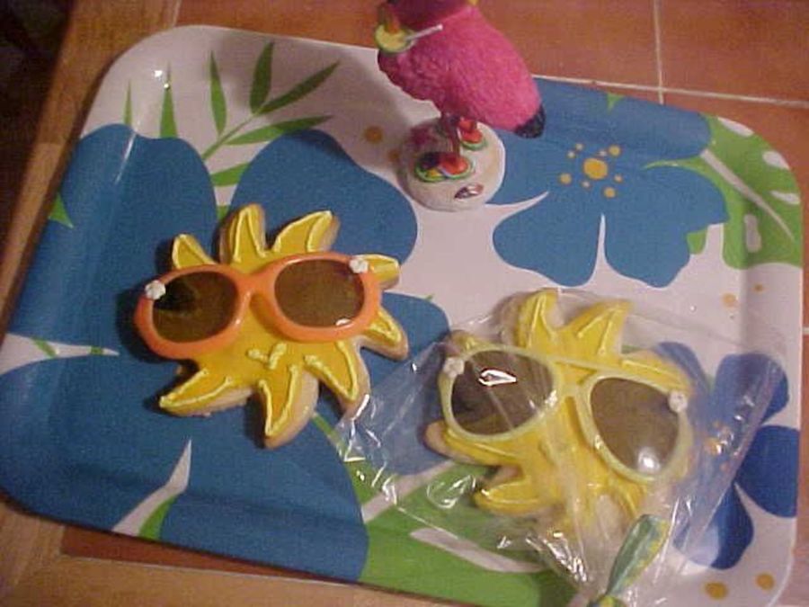 No fail sugar cookies with fondant icing, toy sunglasses, royal icing outline. I got these from the Flour Pot Cookie Book.