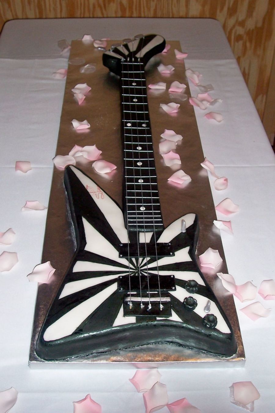Actual 3/4 scale of the grooms prized washburn bass he named "Rudy." The body is a single layer full sheet that was trimed in to the shape of the guitar, The neck is sytrofoam. Everything is covered with fondant and painted with edable paint. All the knobs, swithes and pick-ups are fondant with tylose so they would stiffen up. The silver strings are secured with 1/8" dowes, This was a labor intensive grooms cake. We had a blast!