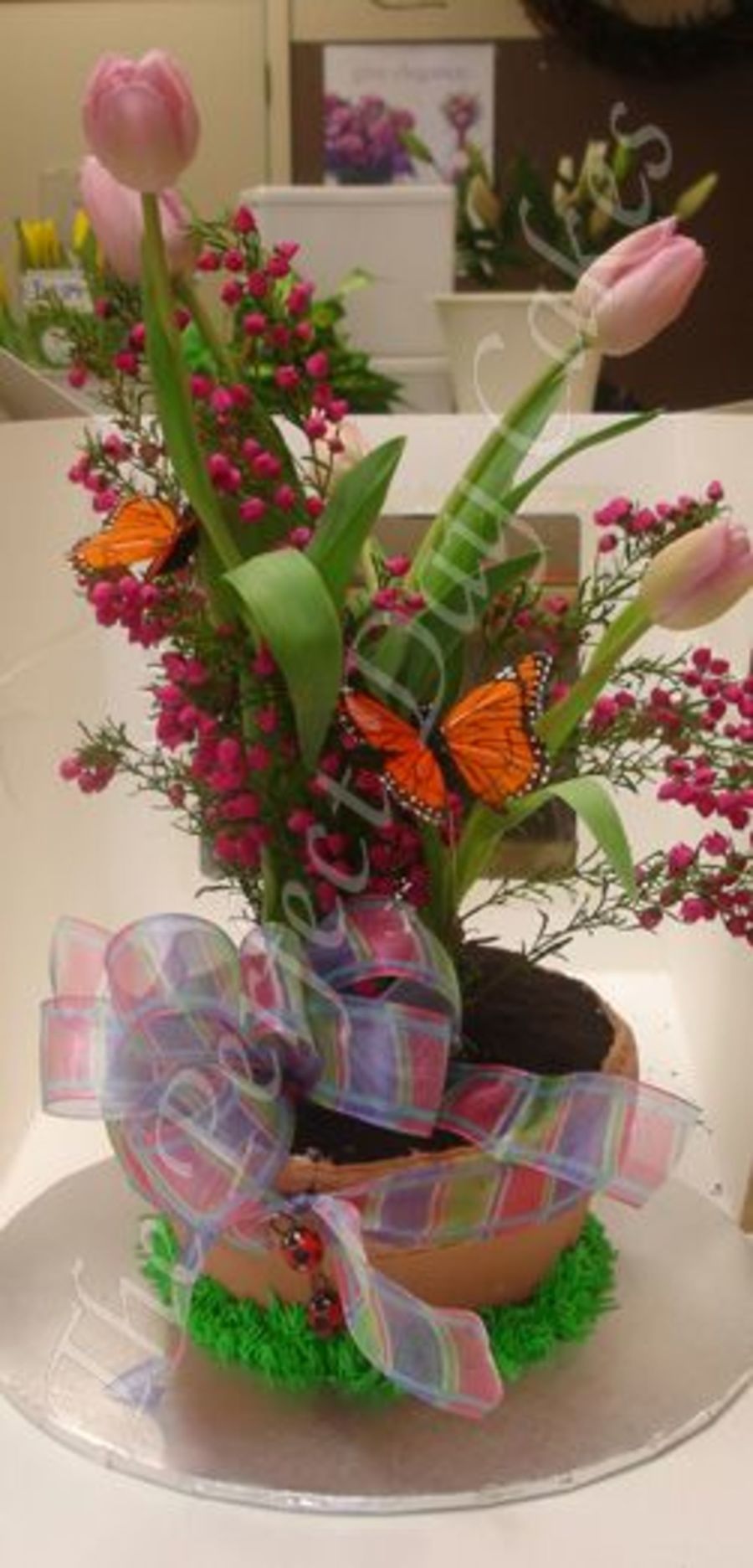 Decorated for a cake auction, the terrra cotta is the cake. Fresh Tulips were placed inside the pot to give this cake an even more realistic feel.