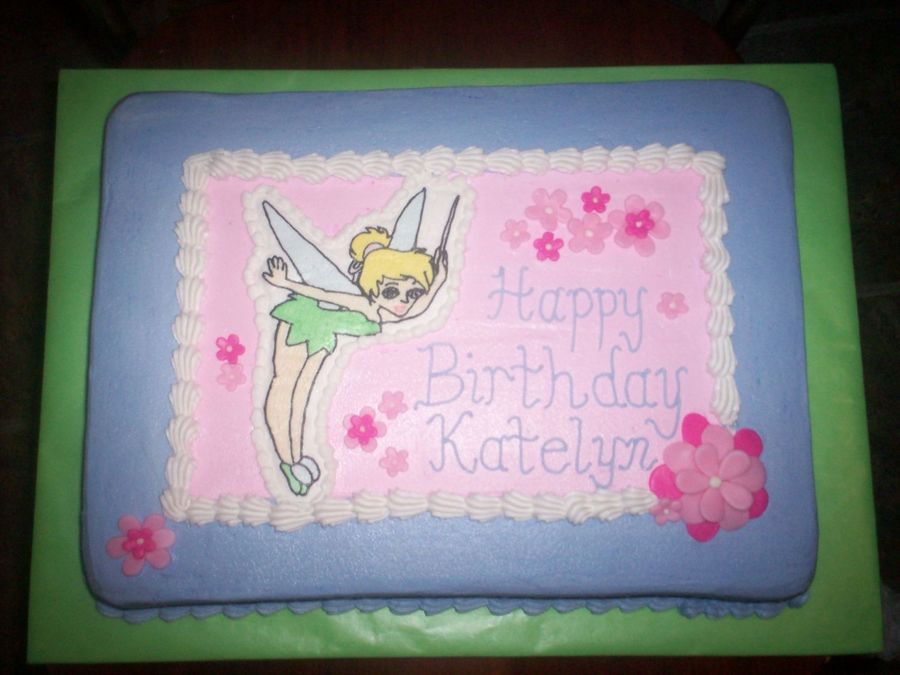 Tinkerbell cake for 1st birthday party. It was made to match the plates, invitations, etc. White cake, buttercream icing, frozen buttercream transfer tinkerbell and MMF flowers.