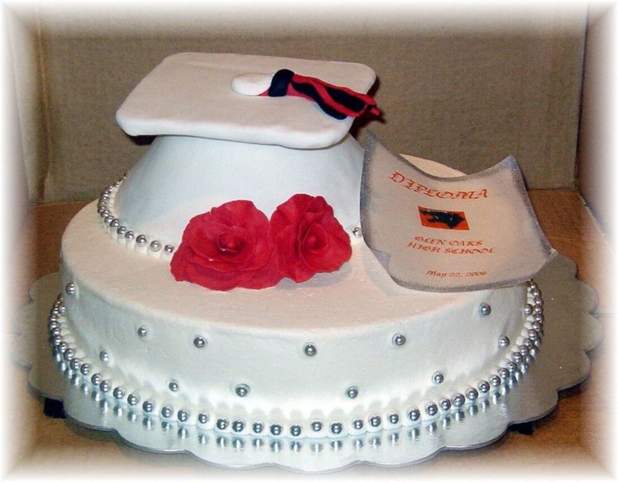 This is another graduation cake like the one in my photos. Special thanks to boween for the inspiration. Cake iced in buttercream with silver dragees. Graduation cap covered in fondx with fondx roses. Diploma printed on wafer paper with edible ink. By the way, I have made a total of 4 of these cakes in 10 days.