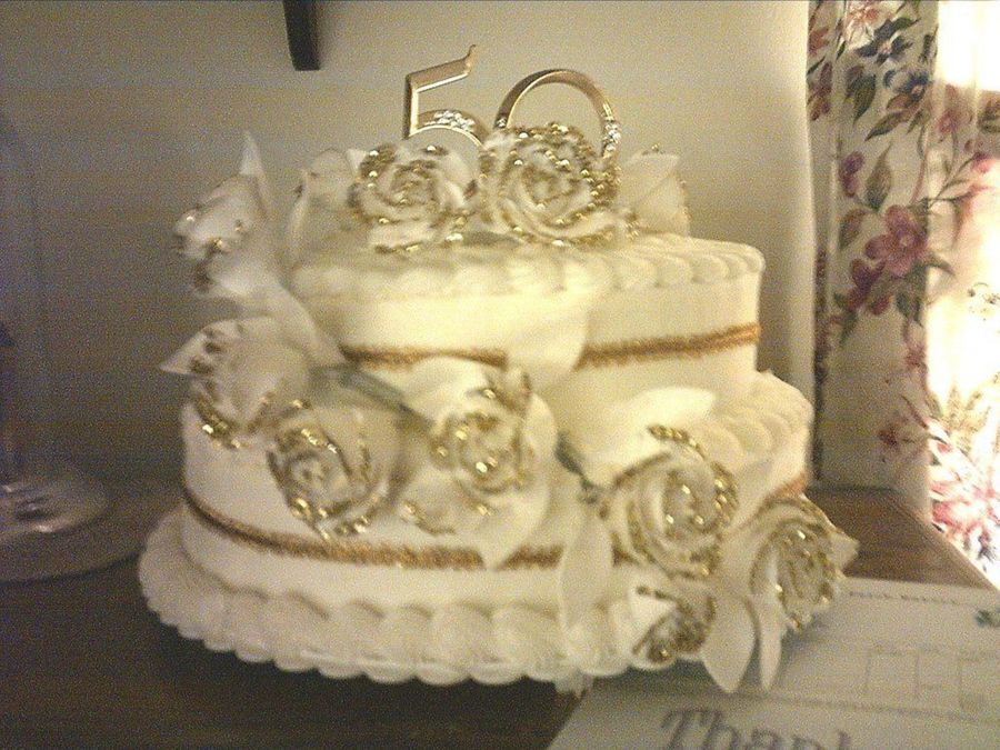 This is a simple stacked cake iced all in buttercream. It has a fondant rose swag down the sides and some more fondant roses on the top. I put gold ribbon around the layers of the cake and the topper is the Wilton gold 50.