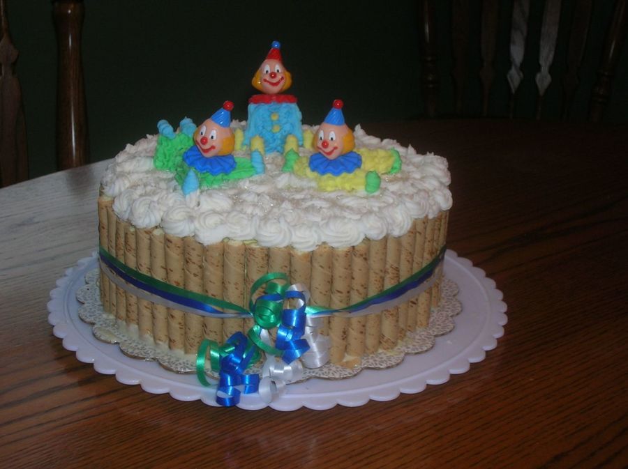 I made this clown cake for my son's birthday. It is a chocolate ice cream cake. It was too hard to icing the sides because the ice cream kept melting so I used Pirouette wafers. It took hours to make since I had to keep putting it back in the freezer. This is only my 4th cake I decorated. I don't think I'll make an ice cream cake again anytime soon.