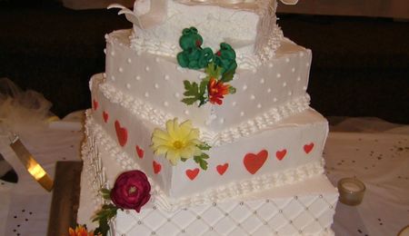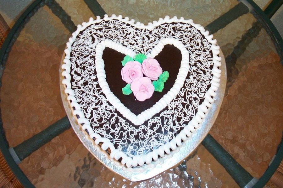 First attempt at using ganache. Chocolate fudge cake with brandy flavoured simple syrup, covered with chocolate ganache. Borders & sotas with bc, fondant roses & leaves. Not happy with borders...did them in a rush. This was just a practice cake. Wanted to try ganache. The taste is out of this world!