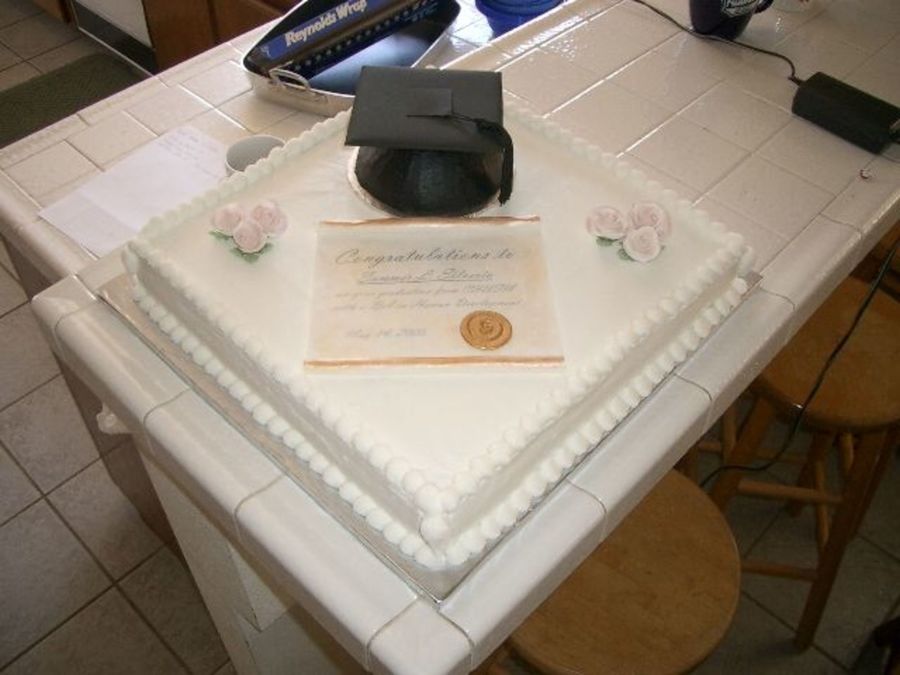 This is a 16" square chocolate cake with chocolate mousse filling and buttercream icing. The cap cake is chocolate cake with chocolate icing (colored black). The Diploma and flowers are fondant. The seal on the diploma is fondant covered with gold luster dust, and the flowers have pearl and pink luster dust on them. It was a huge hit!