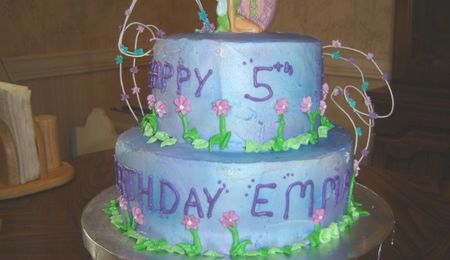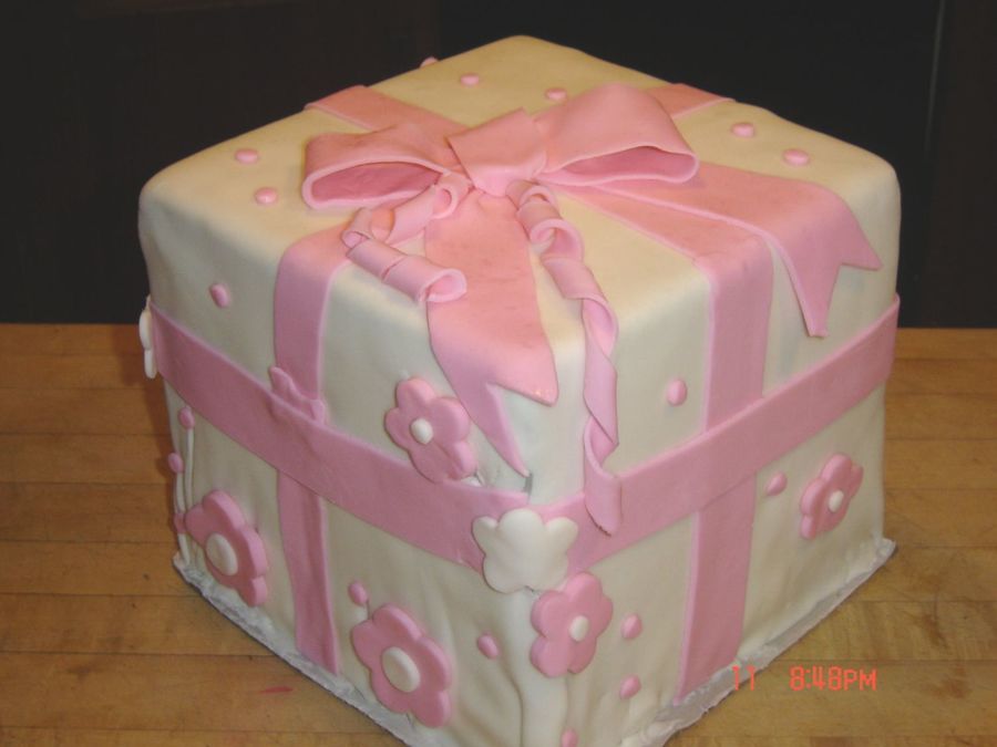 What a mess!! I used a dummy for the cake and it was just WAY TOO HUGE!! I couldn't get the fondant rolled out big enought to cover the cake, so it didn't reach the bottom on a few sides. So i got lots of wrinkles that i couldn't get smoothed out. Then because the cake was so tall, what fondant did hang down the sides, hung down so much that it ripped and tore in a few spots. Overall covering job was horrible. made lots of blossoms and dots to cover everything up, then added an extra row of ribbon.