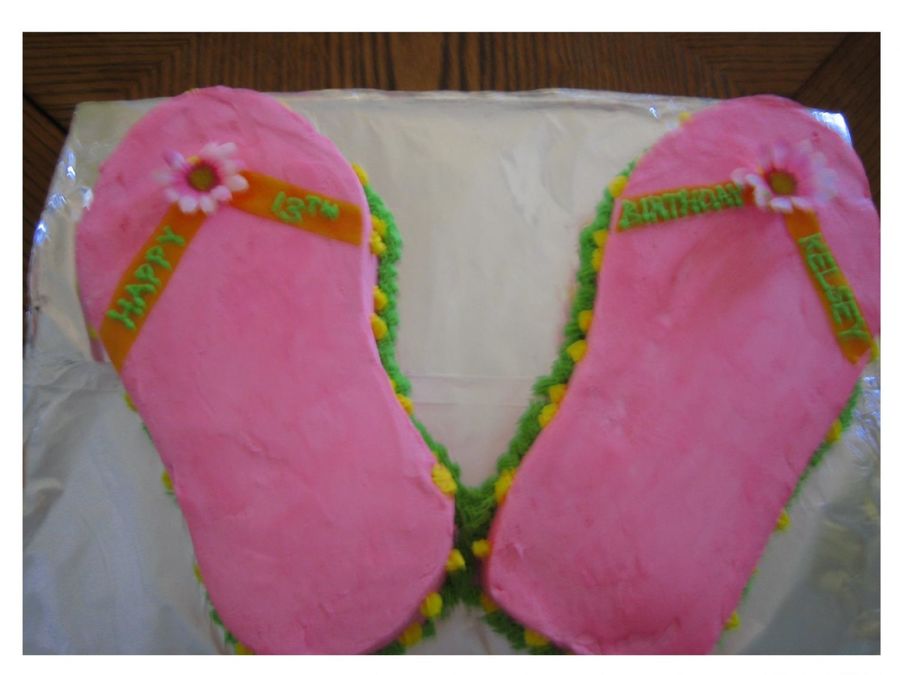 I baked these in a 9x13 pan and traced my own flip flop on a piece of wax paper and then transferred onto the cake and cut around them. Vanilla cake with French Buttercream frosting. The straps were made out of fruit rollups :) and then a fake flower on top!
