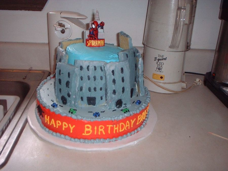 This was for my son's 4th birthday. It didn't turn out like I'd hoped. I used whipped icing on the cake. The "buildings" are sugar cookies iced with buttercream. I will never used whipped icing on a stacked cake again!!! It was a mess!!LOL