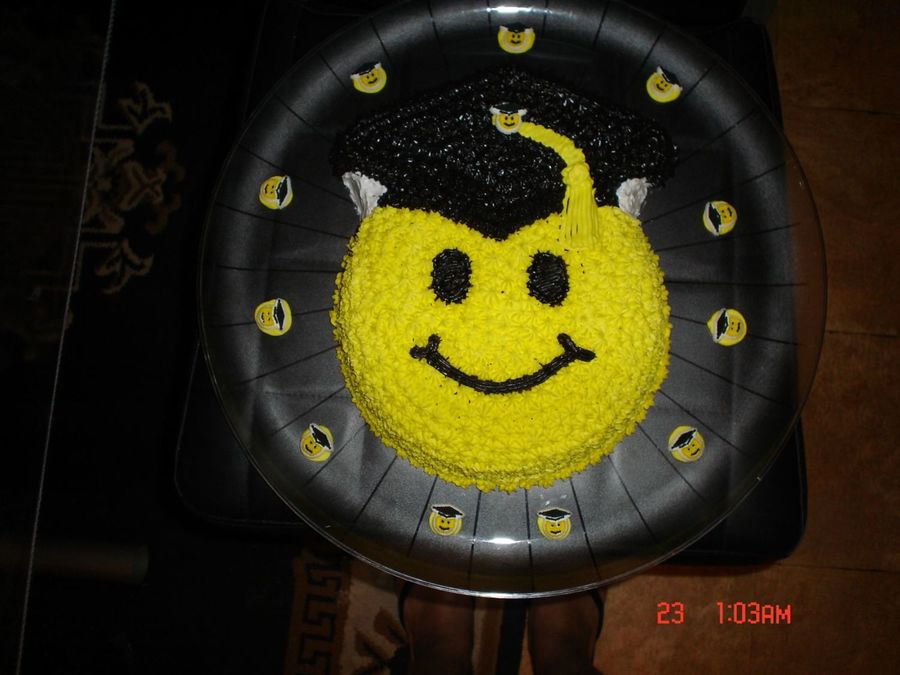 made this for my lil one grad kindergarden i thought i was gonna have a hard time making the black icing but it was easy i bought chocolate frosting and put black tint i think it came out ok