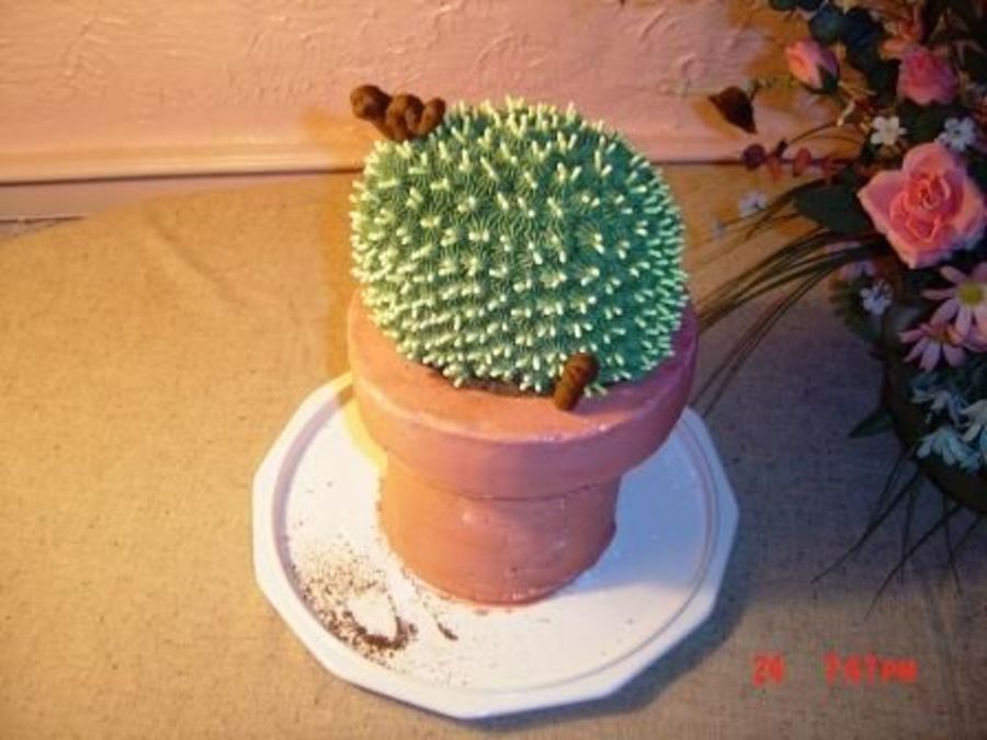My attempt to make a cactus cake for my brother. The cactus is a pound cake and the pot is a white cake. All the icing is BC and the needles are royal icing. The little worms were a last minute thought made from rolled BC. Everyone thought it was too cute to eat and to this day it sits in a real pot on my mother's desk at work. I made it in August of 2005!