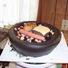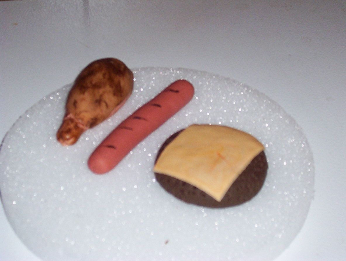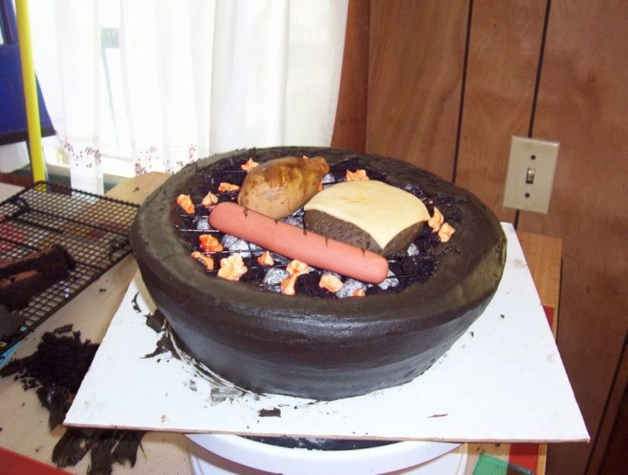 I made this for memorial day. Its my first sculpted cake. Not a complete success cause it is cracking, but I covered it well. Fondant food. Pasta grate. Marshmallow coals.