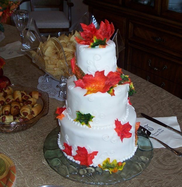 This is cake I made for my sister-in-laws Autumn wedding. It's vanilla cake, buttercream icing, MMF and hand-painted sugarpaste leaves.