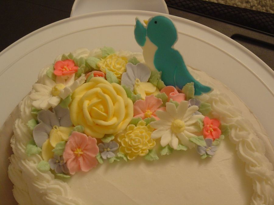 Close up of royal icing flowers and color flow bird.