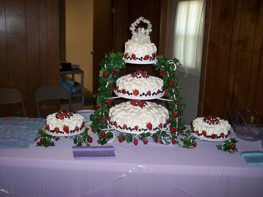 This is the full set up. This cake was quite an adventure! The bottom cake is strawberry pound, middle tier is blueberry pound and the top and two side cakes are white. The cake with icing was almost too big to go into the garden stand, so the fruit had to be put on when we go to the reception hall, which worked out better. I was worried at first, but the finished product turned out better than I thought.