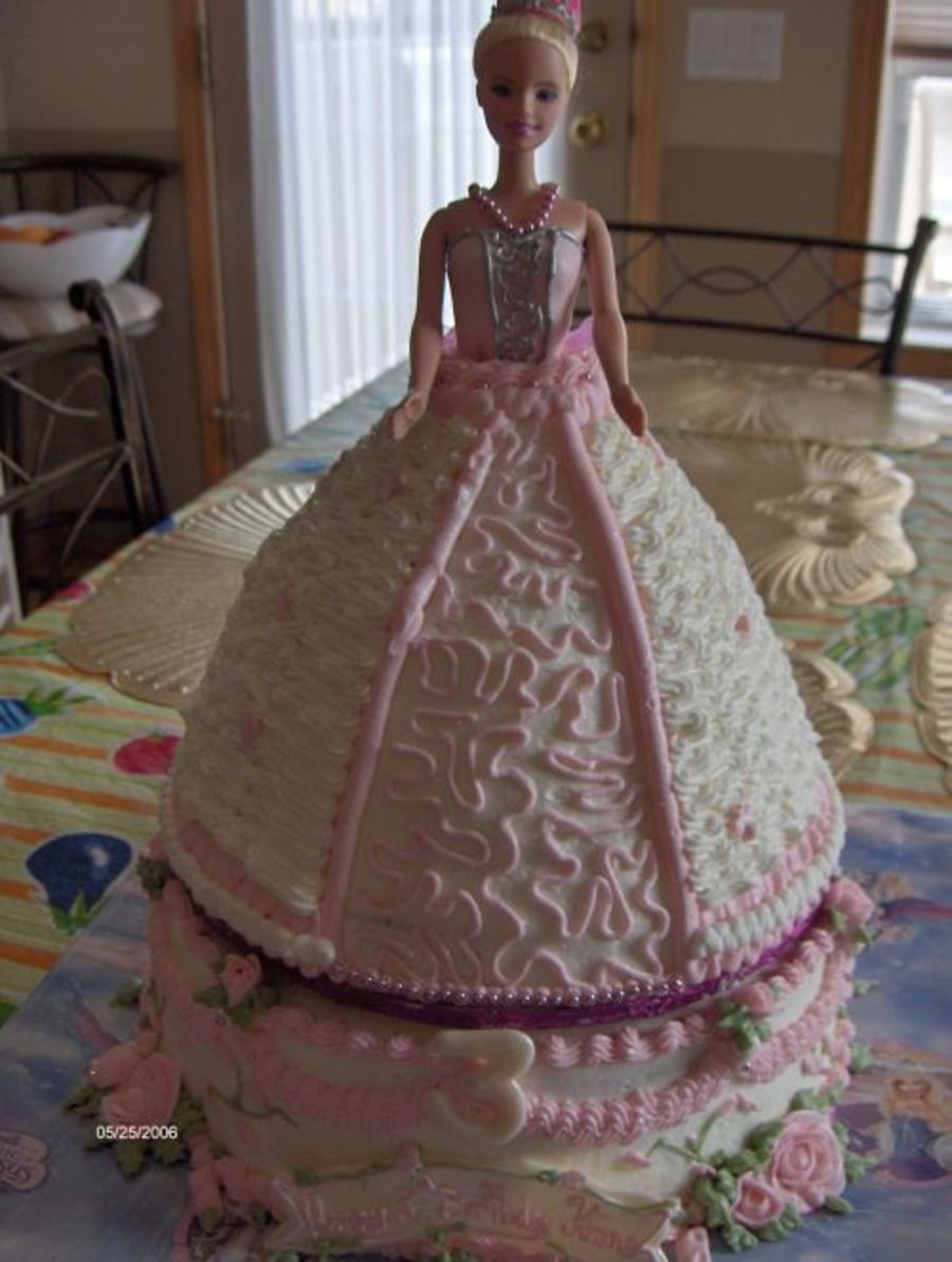 Doll cake for my nieces 3rd birthday.I originally wanted to put it up on a pillared tier but it wasn't as stable as I wanted so I just put it ontop of the bottom layer.Turned out okay..I wished I could have been more creative but there is only so much you can do with the doll cakes in BC.