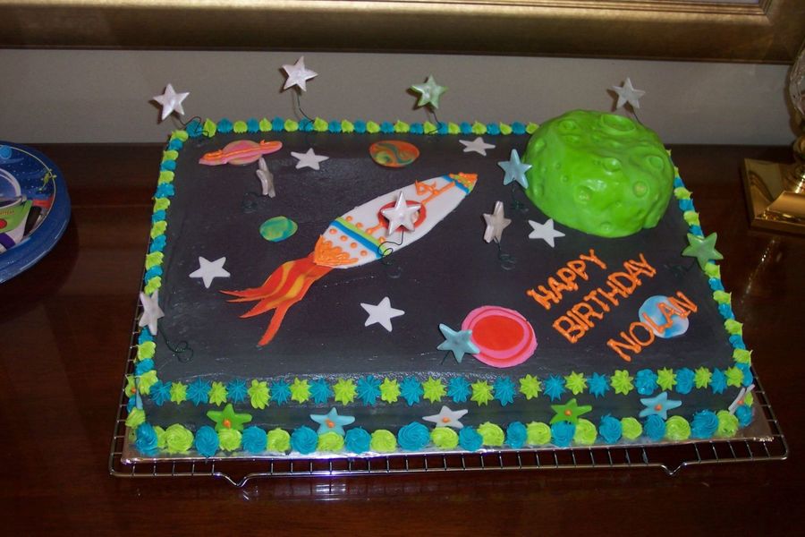 I made this cake for my son's Buzz Lightyear birthday party. I put his face in the rocket window (blocked out by the star) and he was flying toward a RKT moon covered in MMF. My brother in law actually took the moon home to eat! The cake is covered in BC with fondant planets and stars