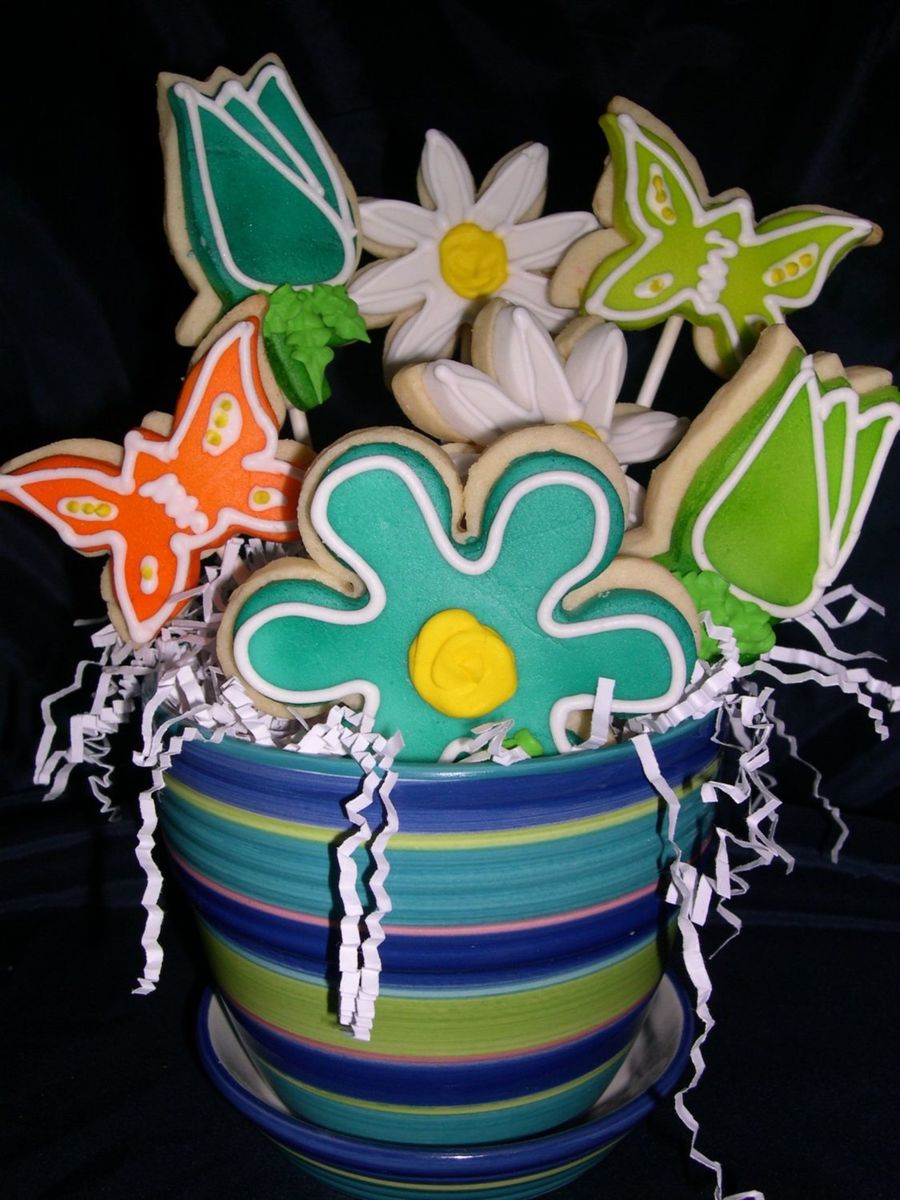 Actually, I really like your presentation. The cookies are really big and well deocrated, and I really like your ceramic flower pot? The colors on the pot echo the colors on the cookies. Really well done!!!!!