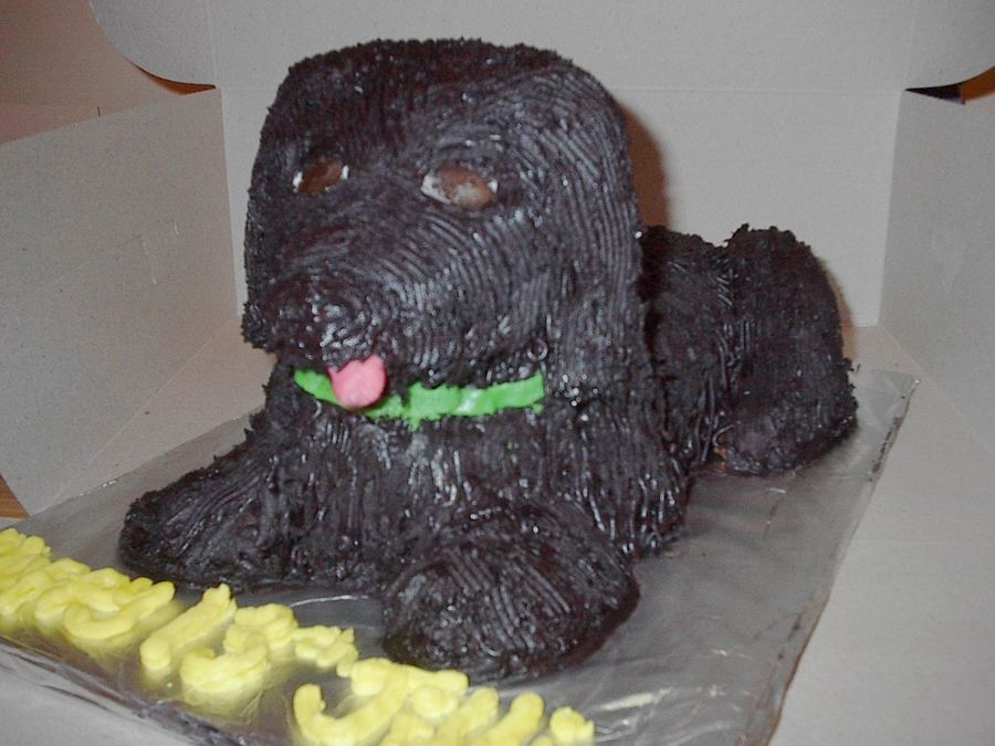 its actually pretty easy - I use the 3-d stand up bear and a loaf pan, the cut off and add pieces until the shape of a dog. Base coat with bc , then pipe on fur with writing tip - for this one i went over it with decorating comb for the shorter fur effect!