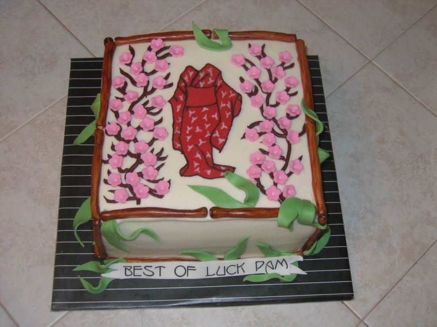 Fondant bamboo painted brown, fondant flowers & leaves w/a chocolate transfer kimono!