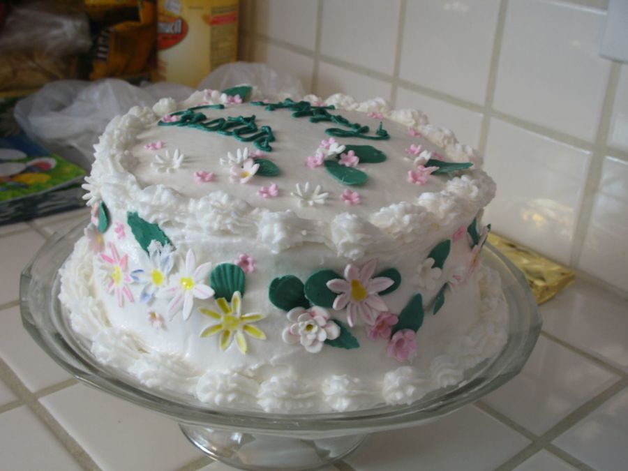This was a white cake with Raspberry mouse layers, covered in Buttercream and then decorated with gumpaste flowers and leaves.