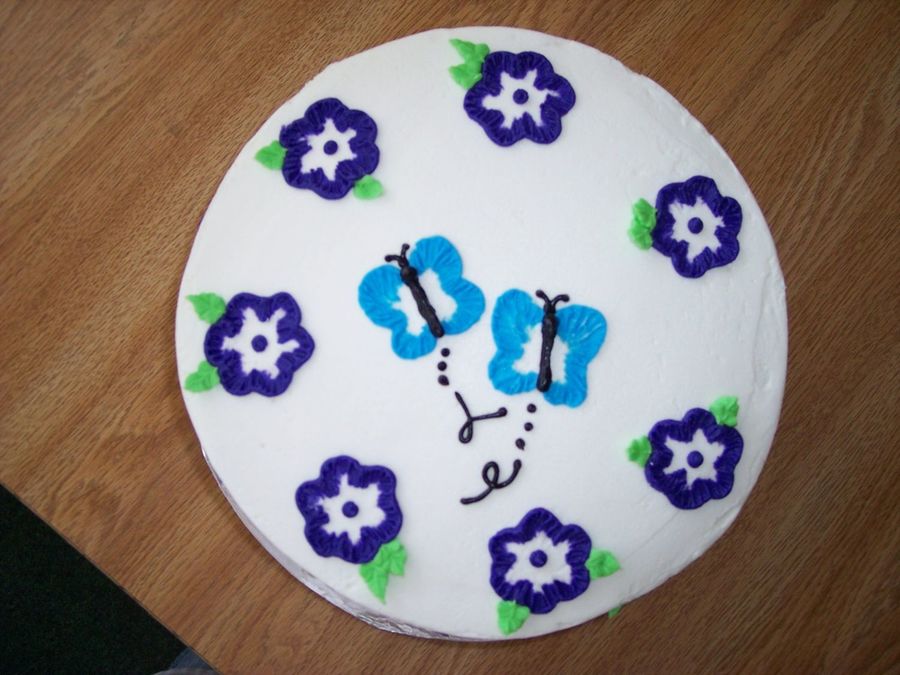 This is a cake I made for a cake auction at my church. It was a fundraiser for our Mission Trip. The purple flowers trail along the side of the cake as well.