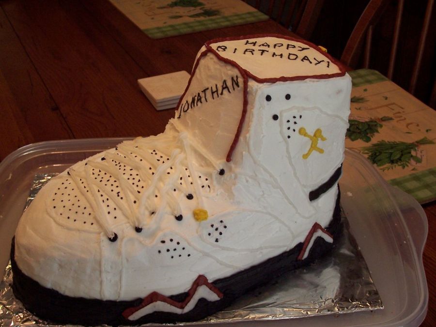 I made this cake from a photo supplied by a friend. The layers are chocolate, vanilla and marble. The very top layer on the collar of the shoe is a combination of all three cakes.