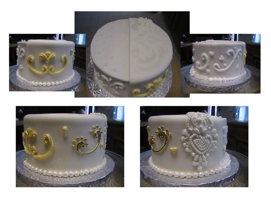 6 in. cake showing different piping decor. Half covered with MMF, half BC. Chocolate with half chocolate ganache filling, 1/4 strawberry glaze, and 1/4 raspberry. Just enough for a taste. MMF side of cake shows template dusting on top. Luster dust painted on side. Silicon bead maker used for pearls, and silicon lace maker. Color was to achieve Champagne color.