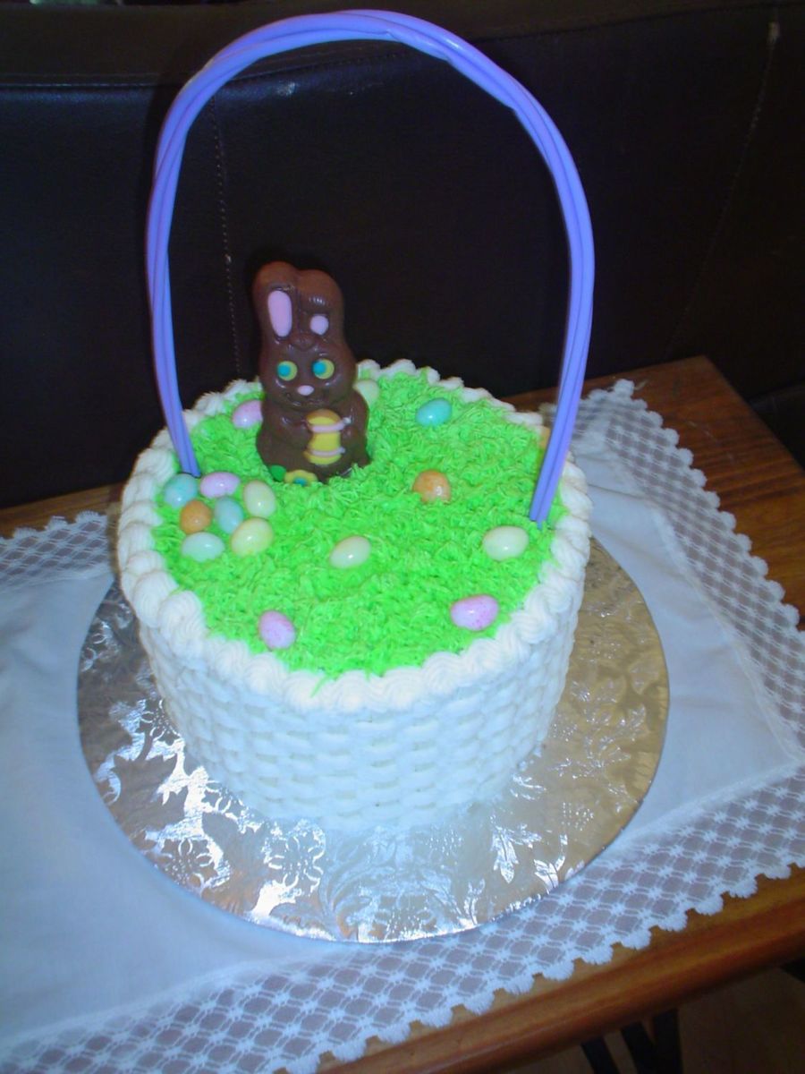 buttercream with jelly beans and a store bought bunny and plastic handle. The insides are chocolate and vanilla with a strawberry buttercream filling (my neopolitan cake).