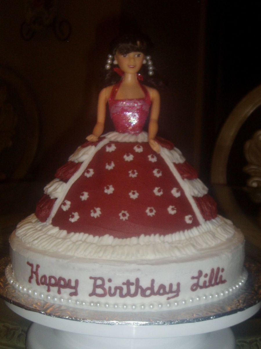 This was my first doll cake. I made it for my friends daughters birthday. The pan produced a much smaller cake than I thought so I put the doll on a round base which was perfect for writing on.