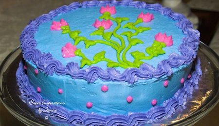 This is a Wilton inspired design. I did this practice cake so I would know how much time it would take to make the actual cake since this is my first wedding cake. I think it turned out pretty well. All three tiers are marble with buttercream filling and icing and royal flowers.