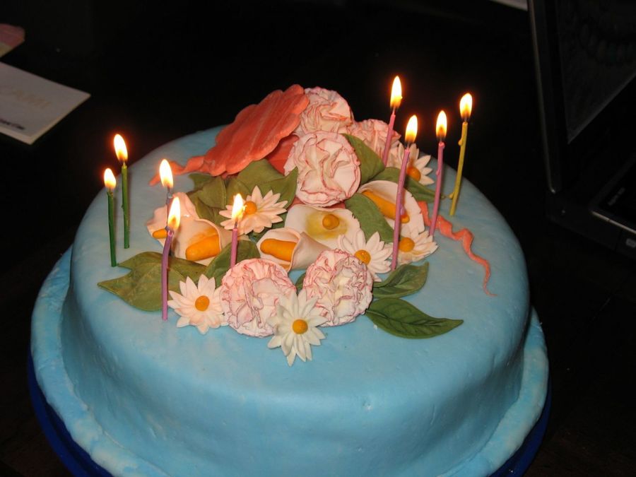 Fondant flowers and fondant covered cake.