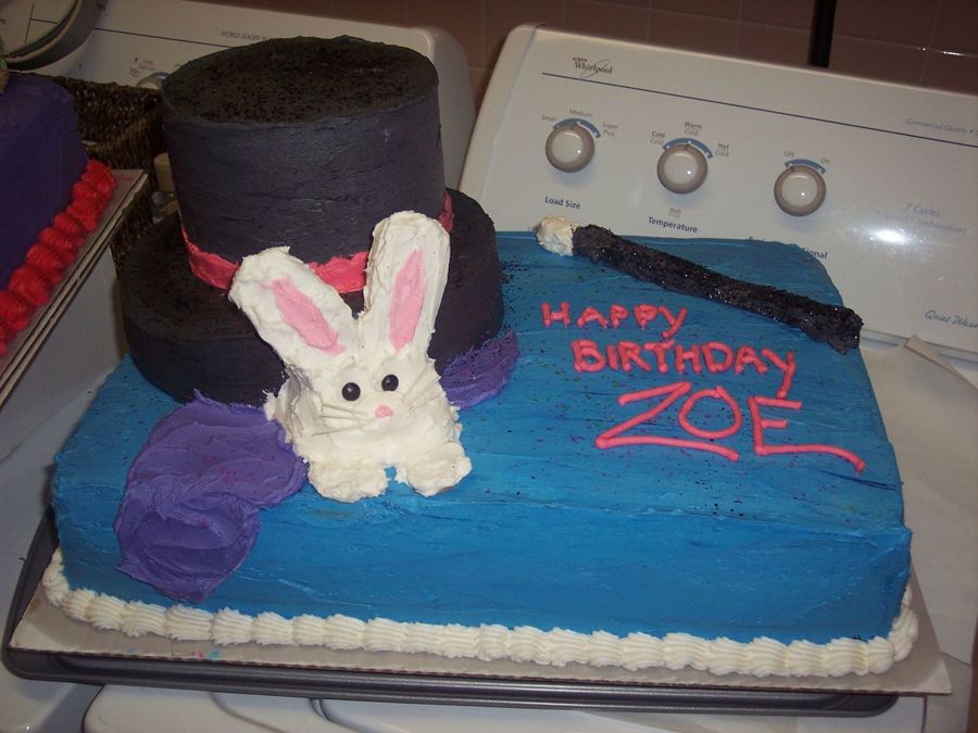 I made this cake for a girls magic birthday. The hat and bunny is all cake!!! The cake must have weighed 30lbs! The wand is a big long pretzel covered in buttercream.