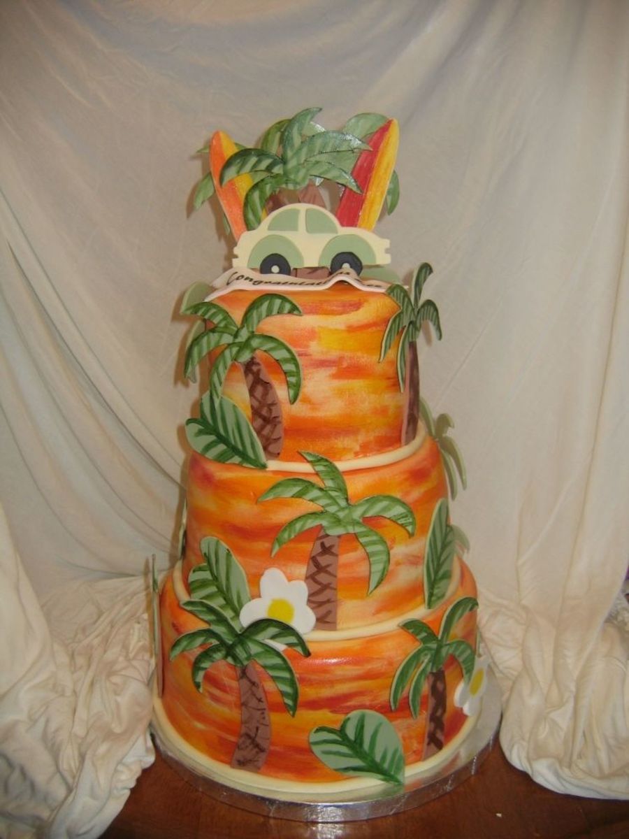 Everything is fondant (palm trees, leaves, flowers, surfboards and car) and then painted w/brush on colors. Design came from Just Fabuluos Pastries. This was actually for a graduate who loves to surf! But this was the before....check out cake diasters for the after!!! :(