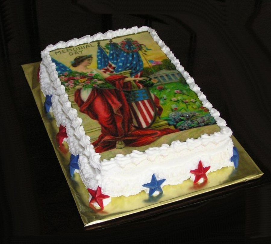 Edible image made from antique postcard graphic. Candy melt stars. Cake was dark chocolate madw with strong coffee as the liquid. Vanilla/almond whipped buttercream icing. This is for a cookout this evening. Hope it's cooled off enough outside that I get there with it intact!