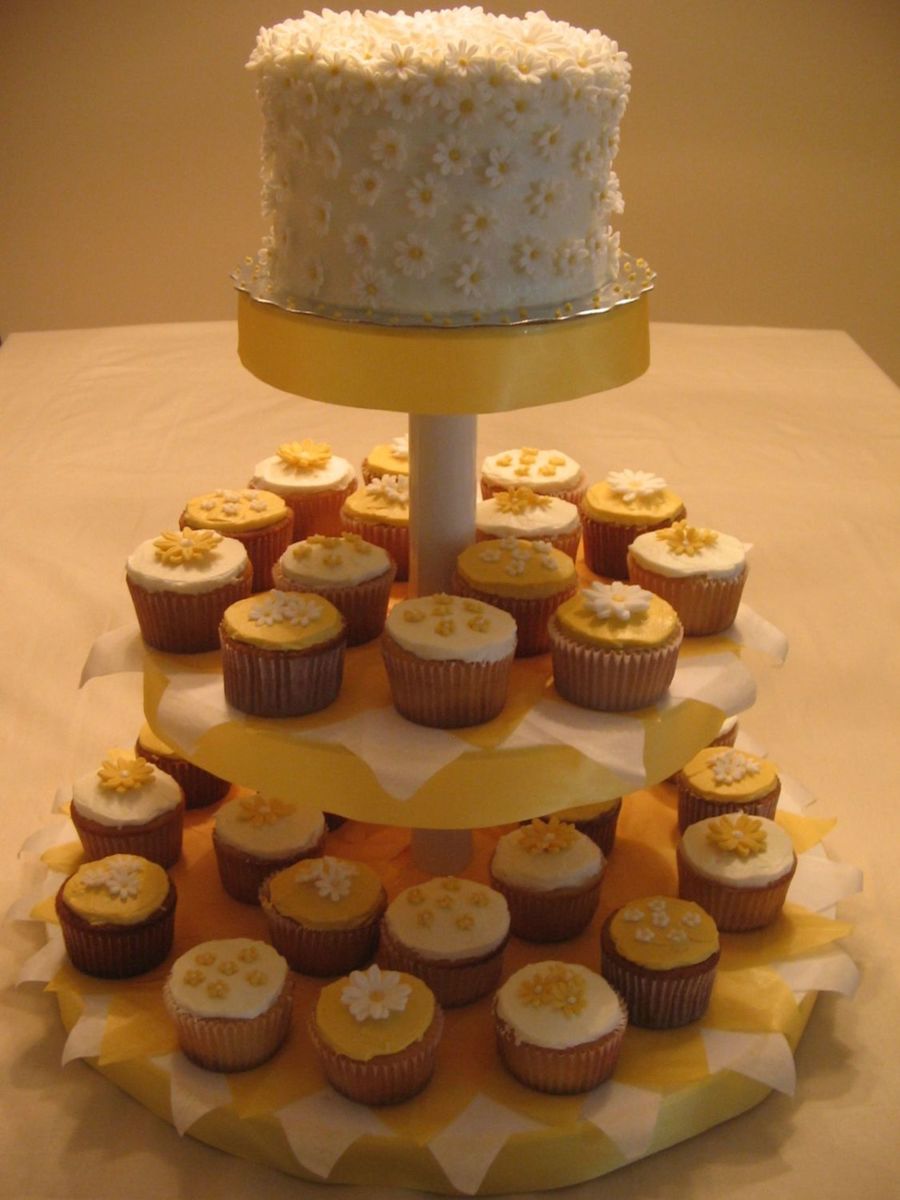 not a wedding cake (was actually for a first communion party), but this was the most appropiate folder i could put this into. vanilla cupcakes with buttercream icing, fondant flowers. topper cake is alternating layers of white & dark chocolate cake.