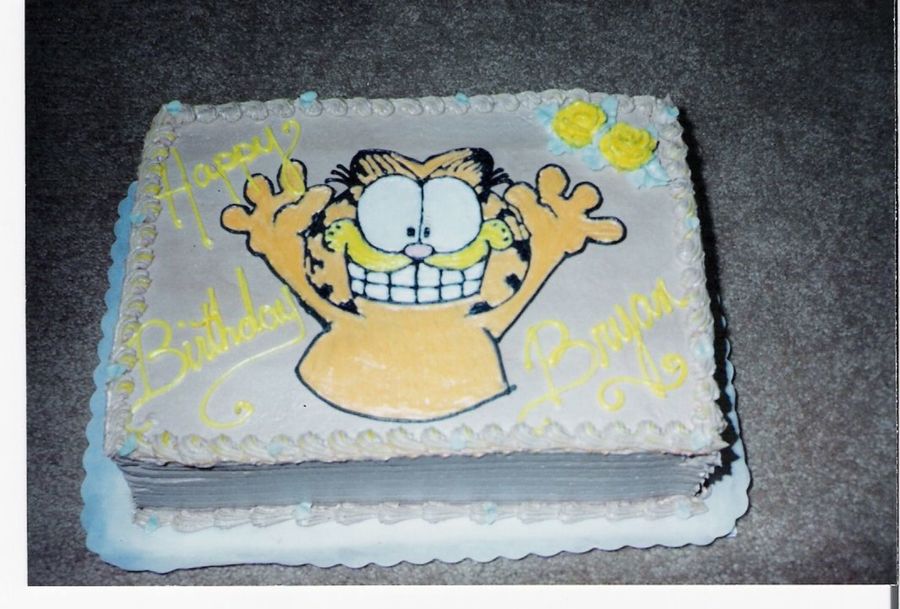 I did this sheet cake all in choc butter cream, i added some hersey to my butter cream. Choc iced and filled.. Garfeild is drawn on to this cake then filled in with butter cream then smoothed..