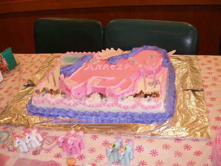 This cake was for my grandaughters 4th BD, I used A willton " My little Poney" pan cake on top 1/2 sheet cake. Both were chocolate fudge cake with chocolate mouse filling. Frosted in Pastry Pride. The wings, flowers, horn, eyes, and hoofs, and butter flys are all wilton RF dusted with lusterdust. And candy rocks for the road.