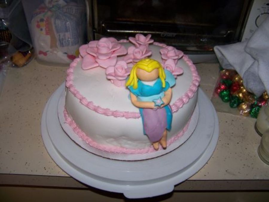 almond flovred cake with buttercream icing between layers covered with MMF. Flowers and Fairy made from MMF.