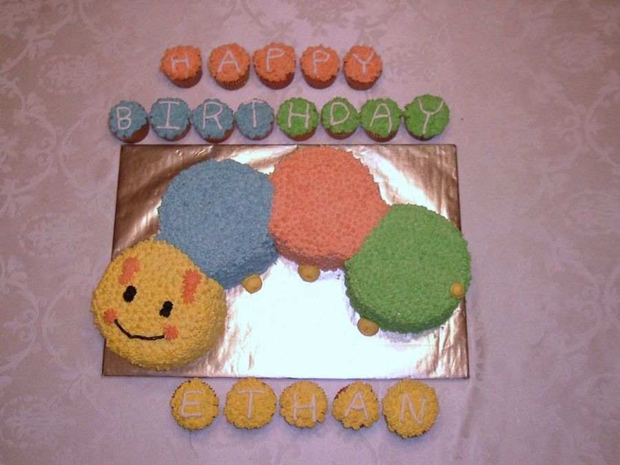 I made this cake for my sons first birthday. It is 2 layer 6 round cakes in the design of the Baby Einstein learning worm. I made cupcakes to carry the letters for Happy Birthday Ethan