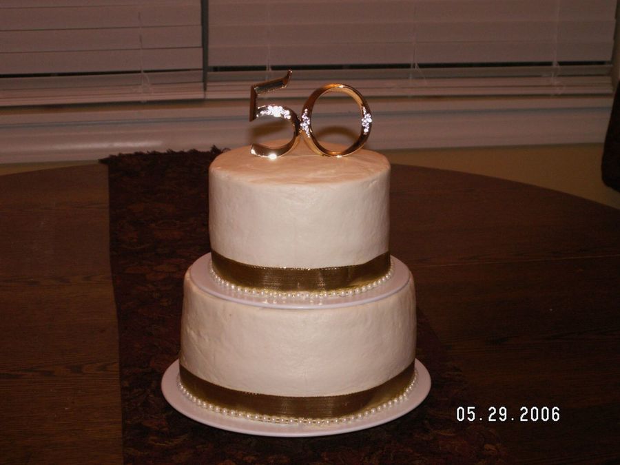 Just a plain and simple cake with ribbons, pearls and a '50' on top from Wilton.