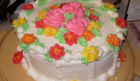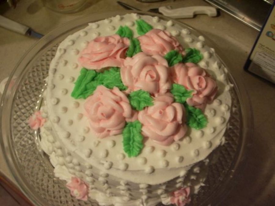 Just for fun. Didn't take a lot of time on it and this is a good example of what happens when you make roses from buttercream that is way too thin! The design is from the Wilton Course I book.