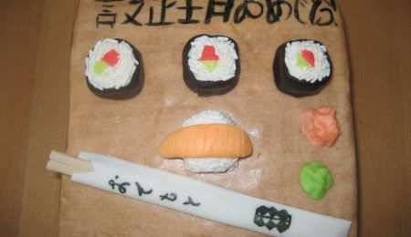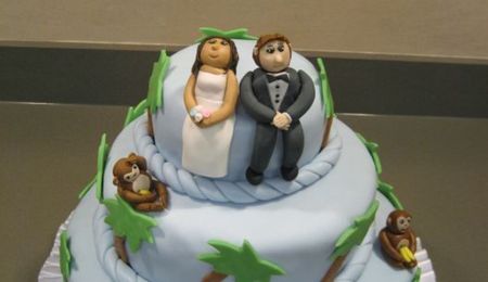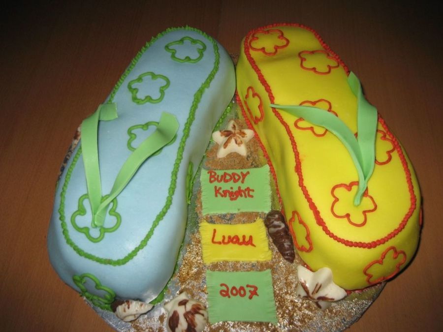 Choc. w/ strawberries and banana whipped cream filling and a pineapple cake with coconut icing and filling. Both covered in fondant. Shells made out of chocolate. Sand is brown sugar.