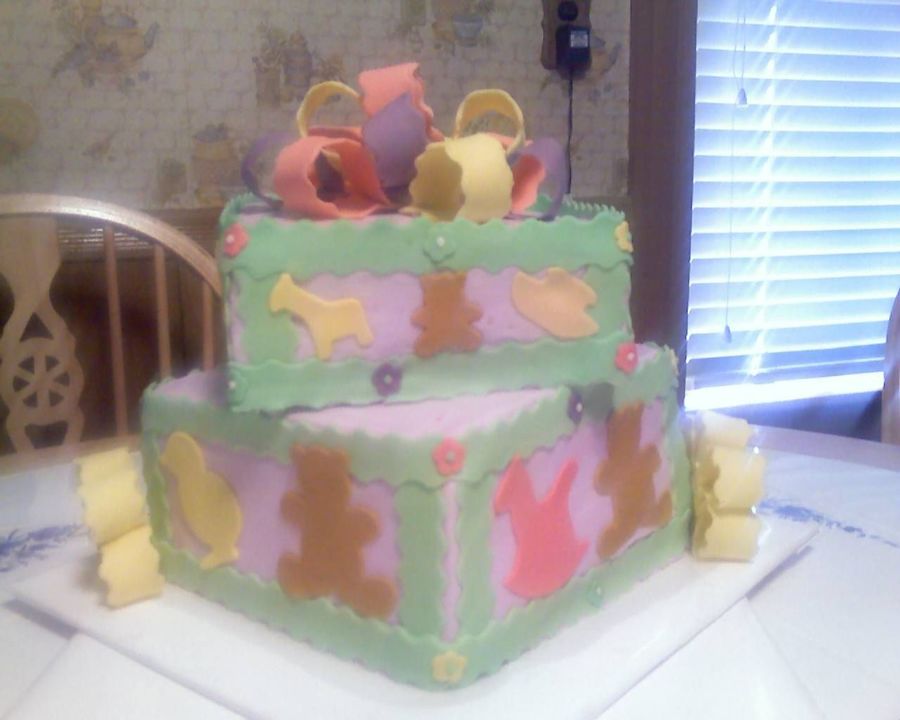 This is a baby shower cake for a little girl. The bottom tier is yellow cake frosted in almond buttercream and the top tier is chocolate frosted in coconut flavored buttercream. I did all fondant accents. I had a lot of fun doing this cake!